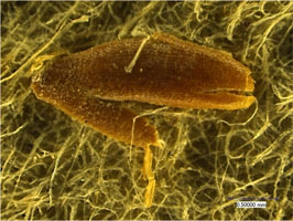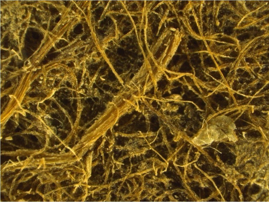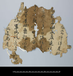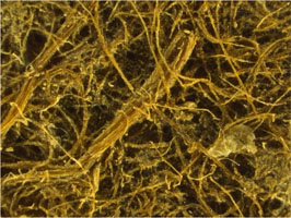 (b)MS03370用紙中の植物茎、種子(殻)。則天文字が記されているので,武則天(則天武后)時代のもの(A.D.8c.初頭) と分かる。アスターナ遺跡で採取された断片中には、このような、植物の遺物が数多く見つかる。唐中央の紙と異なり繊維は不揃いで、粗末である。麻、楮などの主要紙原料が不足していたため、現地の手近かな植物材料を利用した形跡が見られる。これは、イネ科植物(種は目下は不明)の茎、実(殻)である。 戻る |