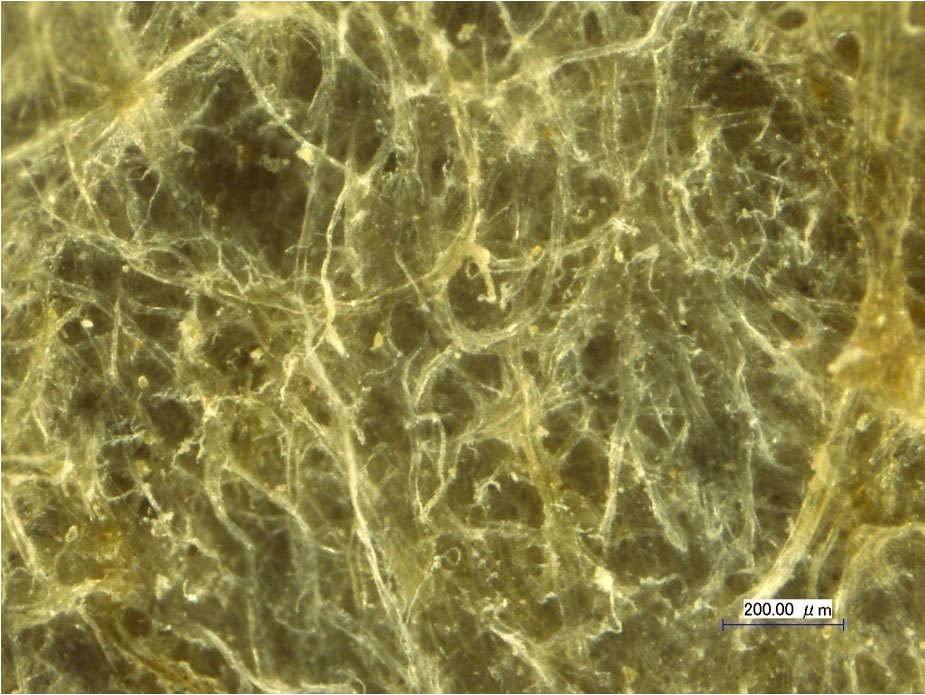 西州天山縣到来文書 MS03476 表 裏●概要ミイラ附帯文書、裏に絹糸(平織)。イネ科植物表皮付着。一種のワラ紙と思われる。 7×30cm ●分析結果 (a)