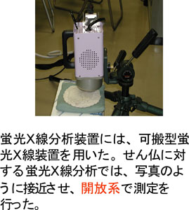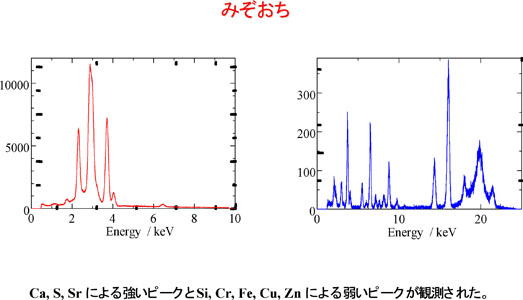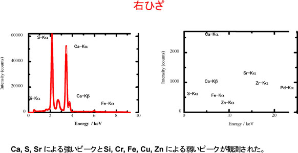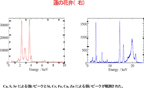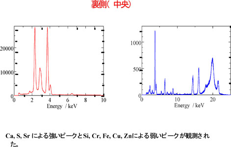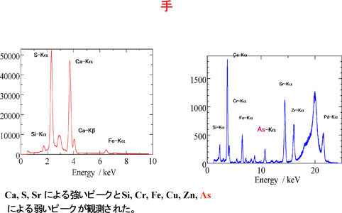 塼仏(蓮華中仏坐像) ,●概要ストゥッコ像 直径17.0cmカダリック出土 5世紀 大谷探検隊将来品。コータン北方のカダリック出土。この塼像は、当初、焼成粘度としていたが、蛍光X線分析により石膏と判明した。石膏は中央アジアに広く産出する鉱物でこの種の像を制作するのに広く利用された。仏教寺院の壁面や、巨大な仏の光背を飾る仏像で、多量に制作されたものであろう。大きな蓮華の中央に、禅定印を結び結跏趺坐する如来像を表している。頭上には肉髻を頂き、頭髪は髪筋を先刻せず、顔面は丸くふくよかで、額はやや狭く、耳は長く、口は堅く閉じている如来像の完成された姿と、蓮華の見事な表現は高い芸術性を備えており、ガンダーラ様式の影響が見られる。古代新疆カダリックにおける内外との文化交流の状況が見受けられる。 ●分析結果「塼仏」における無機化合物の元素および状態分析 ![]() ![]() ![]() ![]() ![]() ![]() ![]() ![]() すべての測定箇所から、S、Ca元素による強いピークが確認できた。これは、せん仏の本体を形成する石膏(CaSO4・nH2O)に由来するものと考えられる。不純物として、同族であるSr元素も確認された。これより精製されていない石膏原料が使用されたものと考えられる。また、表面が赤みを帯びていている部分があったため、そこにはFe元素が検出されると予想していたが、赤みを帯びていない裏側にもFe元素が同程度確認でき、赤みの原因がFe元素によるものであるといい難い結果となった。 顔や手の甲などの肌にあたる部分において、他の箇所と比べ、As元素によるピーク強度が非常に強いことがわかった。As元素は、古来より化粧品や有色顔料(雄黄 As2S3、シェーレグリーン CuH4As2O6・Cu(OH)2 、エメラルドグリーン Cu(OAc)2・3Cu(AsO2)2 )などに使用されていたため、せん仏の肌の部分は他の部分と異なる彩色がほどこされていた可能性がある。 戻る |
