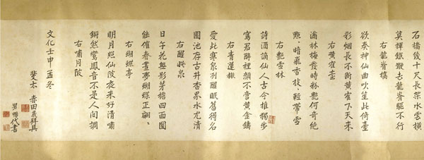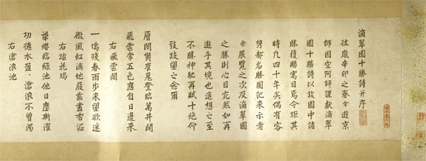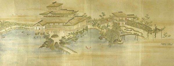 滴翠園十勝 ![]() ![]() ![]() ●概要024.1-100-11巻 40.5×1243.5cm 明和8年(1771) 滴翠園十勝は、西本願寺の境内にある飛雲閣(国宝)の建つ名勝庭園のことである。飛雲閣は豊臣秀吉の聚楽第に建てられた後に、伏見城から西本願寺へと移されたものと伝えられている。この庭園には飛雲閣をはじめ滄浪池、竜背橋、踏花塢、胡蝶亭、嘯月坡、黄鶴台、艶雪林、醒眠泉、青蓮榭の十の景勝があり、これらを滴翠園十勝と称した。そして、この景勝を讃える詩歌が多く吟詠されている。 この彩色写美絵巻の序文には、文化5年(1812)、赤田義が詩を附している。巻初に本図巻作製の因縁を叙し、「40年以前に滴翠園十勝を選んで、各の勝景に因んで詩を賦していたのを、たまたま『都名勝図絵』を披見して想起したので、飛雲閣図を描いて十勝の詩を記録した」という意味のことを述べ、次に五言絶句の漢詩が詠まれてあり、作者の署名がある。 戻る |