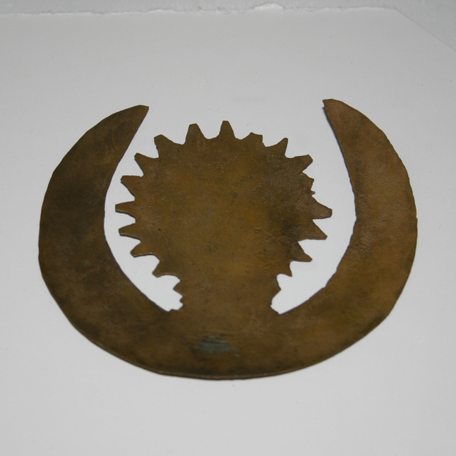 | Brass. Diameter 8,7. The ring opened above wide with the extended ends, in center of which the disk with the tooth- rays (diameter 5-5,5; in all on the disk of 20 teeth, along the outline of disk they are distributed unevenly) is located. On the reverse side the tracks of soldering (possibly, the tracks of fastening to the crown, adorned the head of statue „K„P 590/979). „K„P 590/958. „L„y„„.: see „K„P 590/979. |