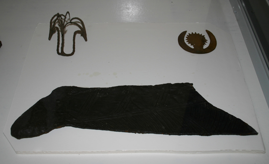 | Skin. Height 34,5, width 10,4. It is sewed of two sheets of dark brown dyed skin; body of boot is decorated with stamping, the head of boot is smooth. „K„P 590/959. „L„y„„.: see „K„P 590/979. |
